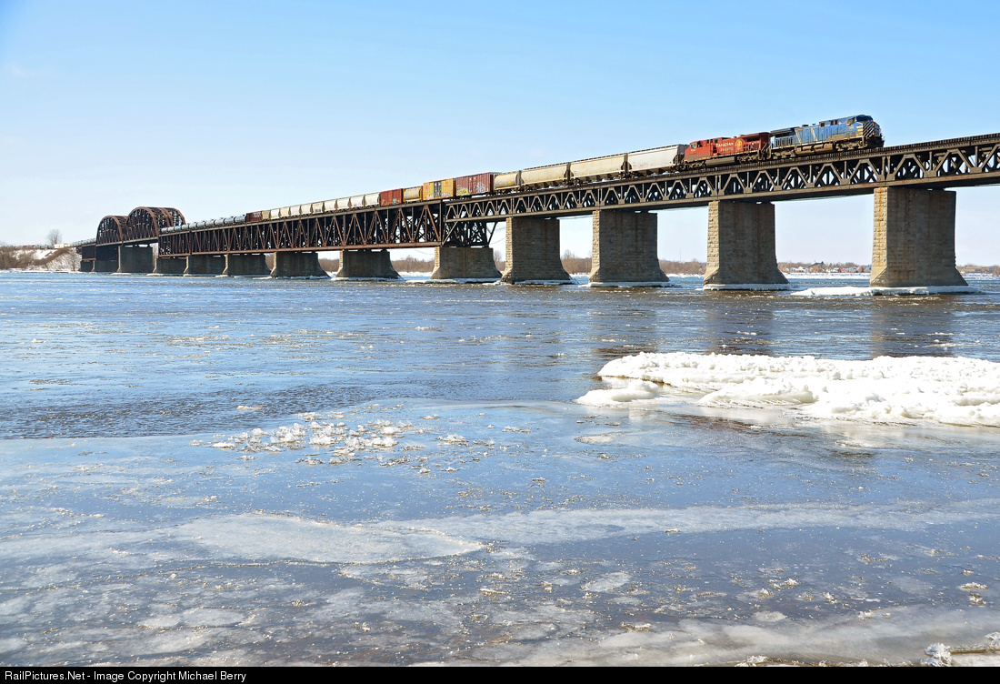 A fairly long CP 253 has CEFX 1006 & CP 8503 as power as it crosses the frigid St. Lawrence river on its way to the island of Montreal on a very cold morning.