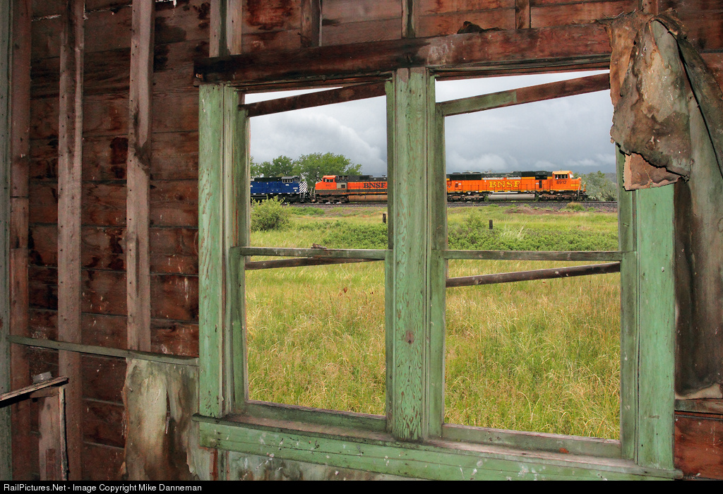 A view through the windows of an abandoned ranch house at Clarkston, Montana, reveals a BNSF freight roaring eastbound on Montana Rail Link’s Second Subdivision on June 16, 2014.
