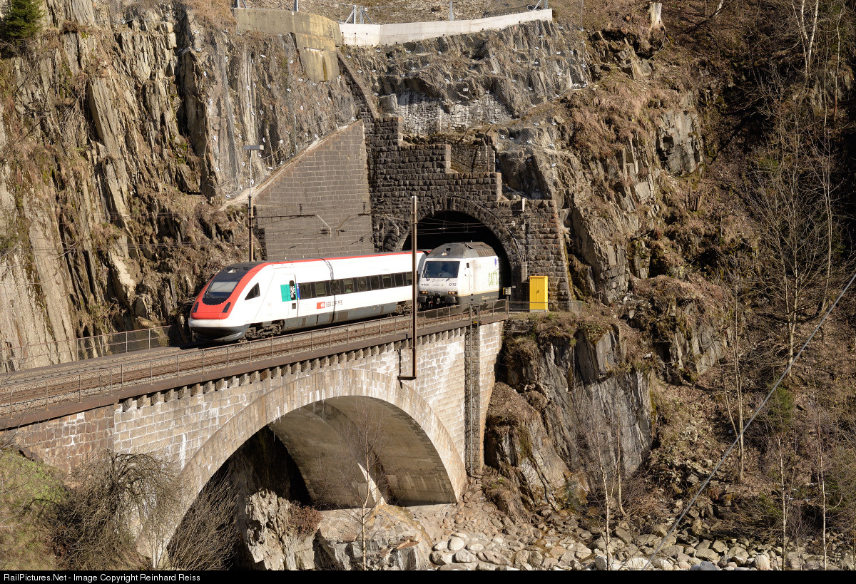 | Locomotive 465 015 "Cats Eye" leased from BLS heads Railcare train 50512 northbound, just leaving the Wattinger tunnel. An unidentified ICN is on the way to the south. |