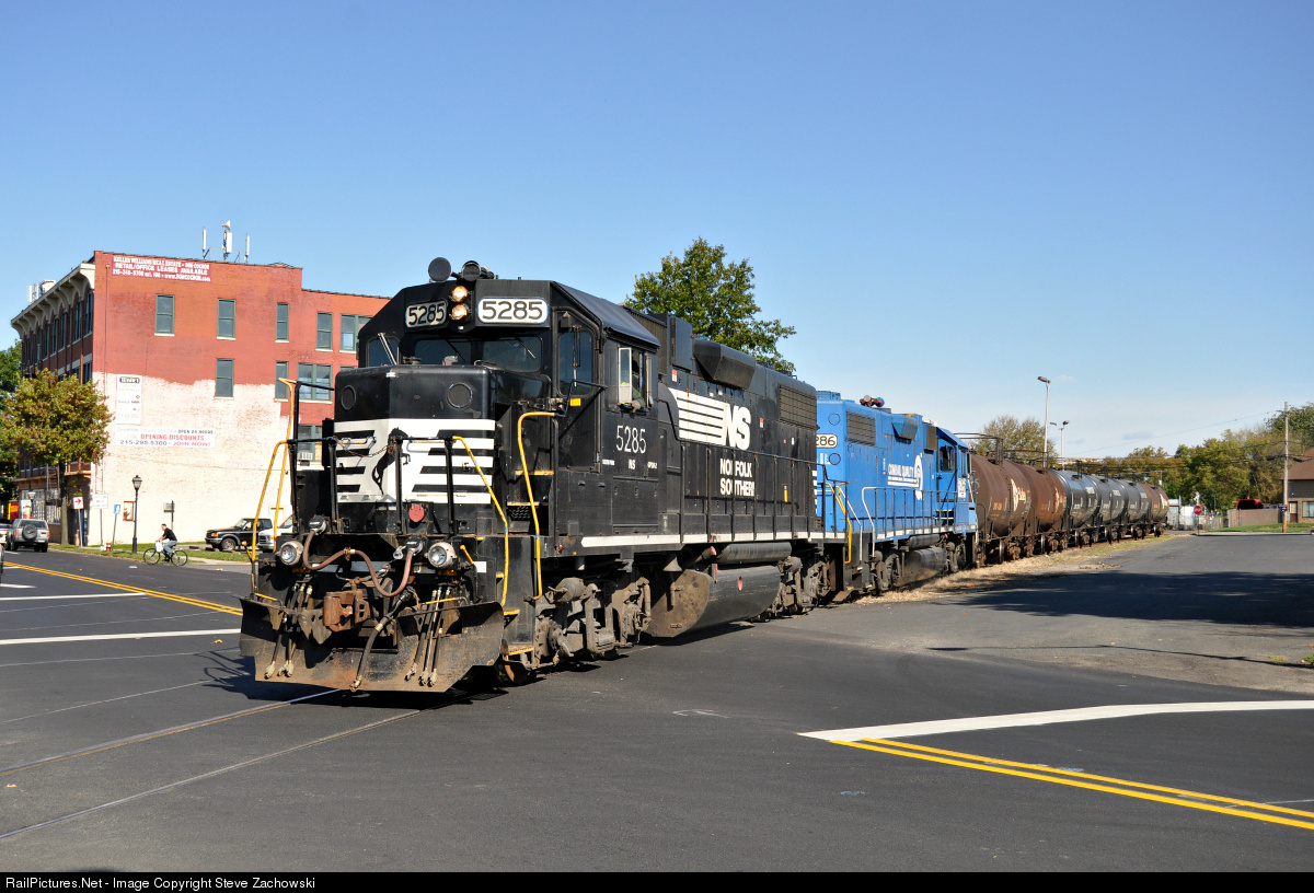 After servicing Staley, YPMO-R1 is seen heading back to Morrisville yard now with NS 5285 leading. NS 5285 is also of Conrail heritage and if one is to look closely, hints of Conrail blue are bleeding through the NS paint.