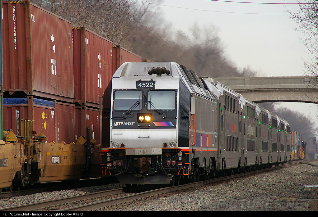NJT Raritan Valley Line train 5123 races west, passing an NS intermodal. One of the unique spotting features of the NJT Dual Modes is the spot for a second horn just to the left of the K5LA, if you look very closely. While NJT does not utilize this feature, AMT of Montreal does, creating a very odd setup of dual K5LA's.