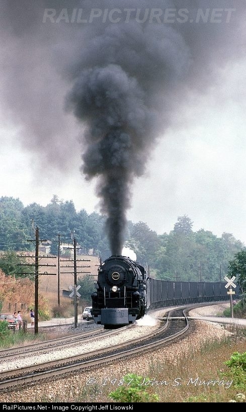 Photographer- John S. Murray- from the 35 mm original Kodachrome slide. The 1987 NRHS Convention was a watershed moment for mainline steam in the late 1980's. What has commonly been referred to as "Super Saturday," saw not just N&W 'J' 611 under steam, but the newest addition to the excursion fleet; N&W 'A' Class 1218. Here we find 1218 headed west storming up Christiansburg grade with 50 empty hoppers in tow at Shawsville on the way to Radford. Out of the picture but hot on the Big A's heels is 611 with a 25 car passenger consist. The 'A' and the 'J' see-sawed up the mountain allowing the passengers a once in a lifetime opportunity. Oh, how I wished I was there that day.