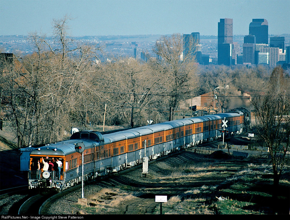 With three of his private cars on the rear chartered by happy groups, the Anschutz ski train glides into Arvada, Colo. headed for those skyscrapers of Denver on the old D&RGW on April 1, 1995.