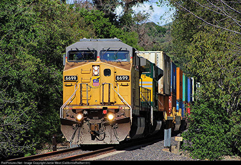 | Union Pacific's Marion, AR to Oakland stack train (KMNOA) passes through Sunol led by AC4400CW #6699 and UP 1995, the CNW heritage SD70ACe. |