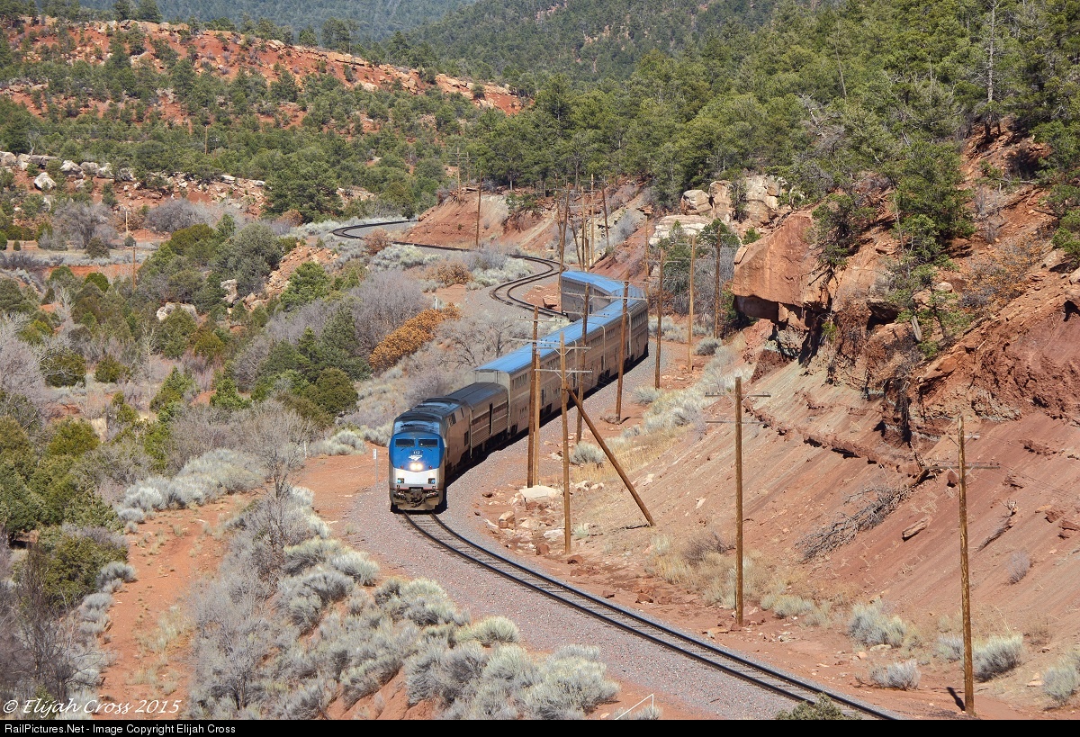 | Seen here, Amtrak's westbound Southwest Chief #3 slowly negotiates the twists and turns of scenic Glorieta Pass on an absolutely beautiful early spring afternoon. |
