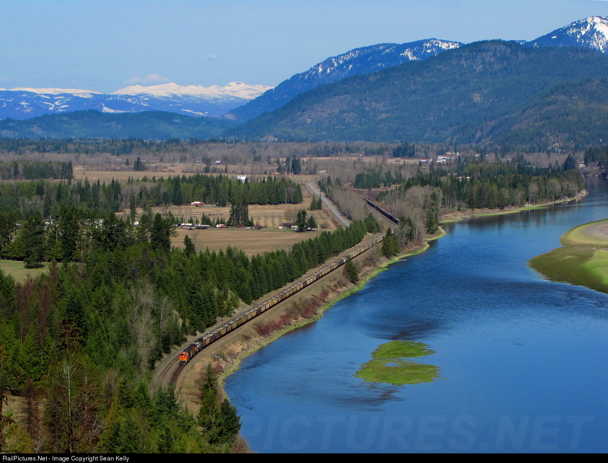 Spring has just arrived in the Idaho Panhandle as an eastbound empty coal train approaches the east switch of Colby at the west end of the Cabinet Gorge. In the distance can be seen the Selkirk Mountains west of Sandpoint, ID.