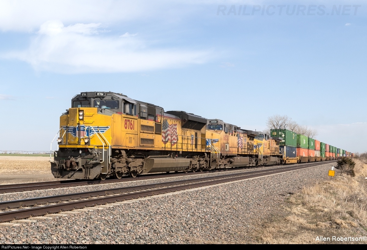 | UP 8761, 6030, & 9458 are westbound on UP's Marysville sub. In approximately fifteen miles the train will be passing through Gibbon Jct. |