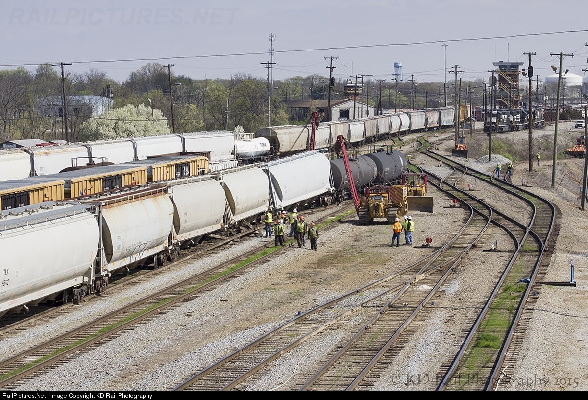 Life at the hump yard continued as one of the hump job push a line of car from receiving track number 1 to the hump , but their was a minor wrench thrown in today's plan as receiving track number 9, 8, and 7 was temporarily taken out of service due to a derailment on receiving track number 8 with five cars on the ground it surely drew some attention to the people in charge of the yard operation. With RJ Corman crew, and heavy equipment, along with NS Maintenance Department, and their equipment on standby, work on getting the derailed cars back on rails, and down to the car shop, and getting the small section of damage rail replace, and getting receiving track number 8 back in operation, this sequence took about 12 to 16 hours.