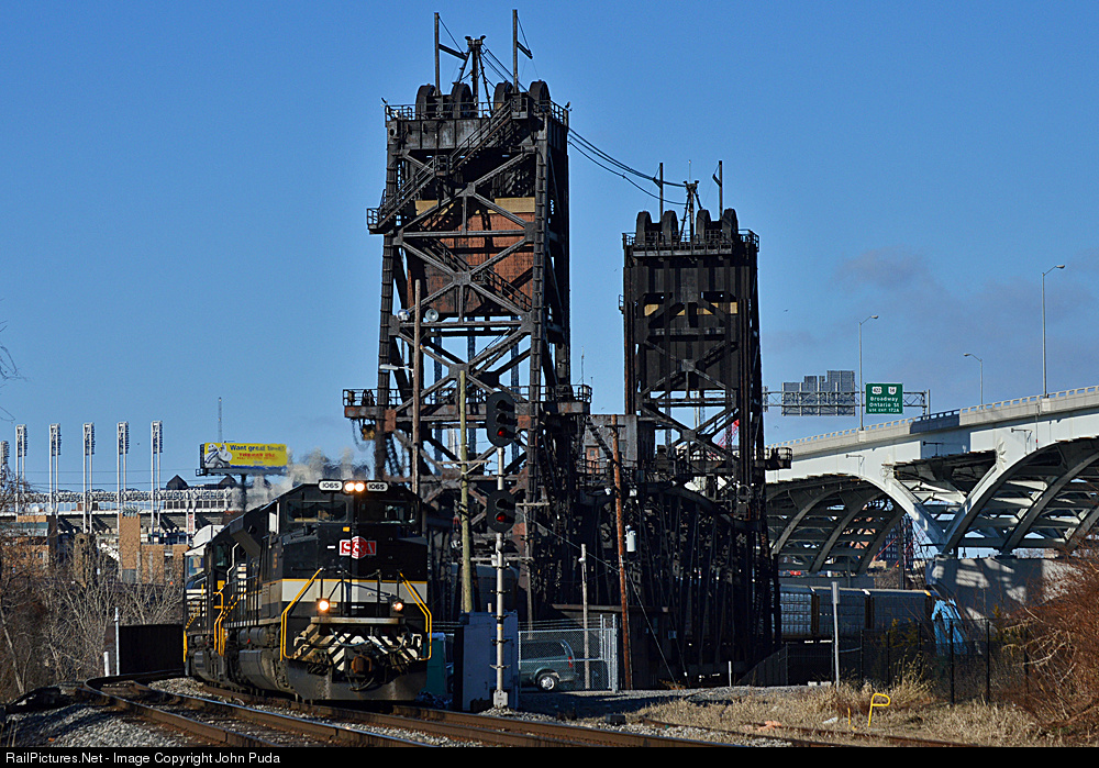 The S&A heritage unit leads auto rack train I87 west as it comes off of Drawbridge 2 over the Cuyahoga River.