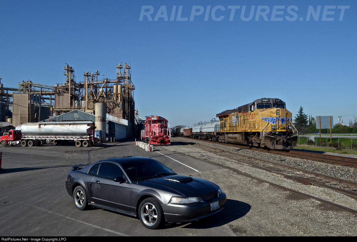 Some switching power and UP 5387, a DPU are mingling with a tractor trailer and a Mustang.