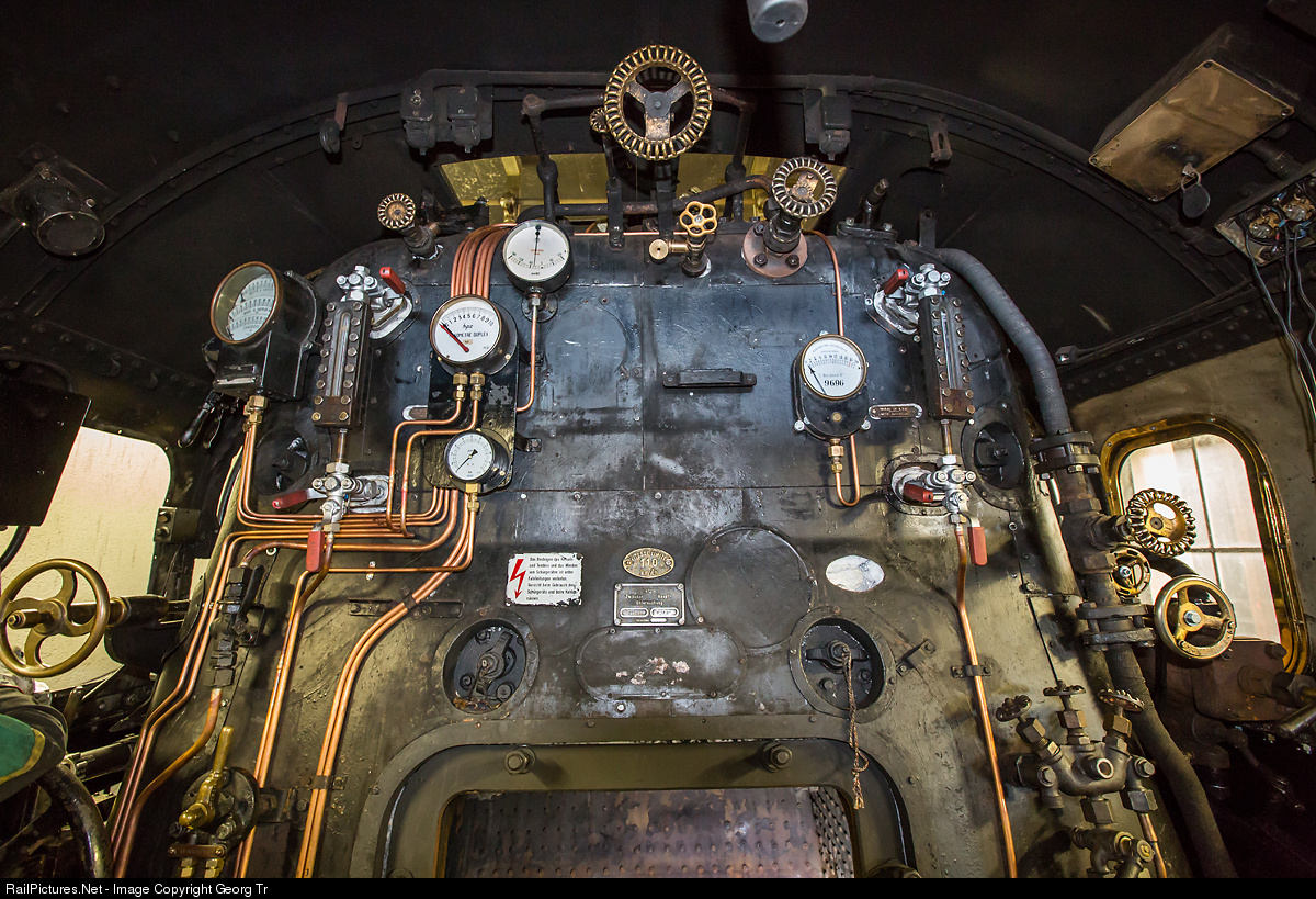 Cab of the former French Railways express train steamlocomotive 241 A 65 (4-8-2), built in 1931 by Fives/Lille. The coal fired four cylinder compound locomotive with a max speed of 110 km/h is owned and operated by association "241 A 65", got a large boiler repair with replacing of nearly 1000 staybolts and will run again soon. Driver is on the left side, fireman on the right.