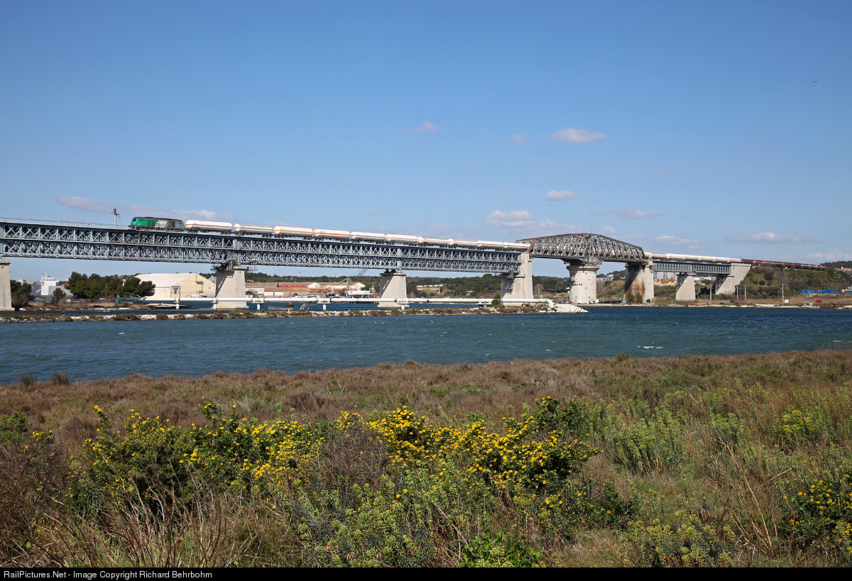 | The locomotive is crossing with 32 empty tank cars the Caronte Bridge, total length 943m (1032yd). The section on the right is a swing bridge. |