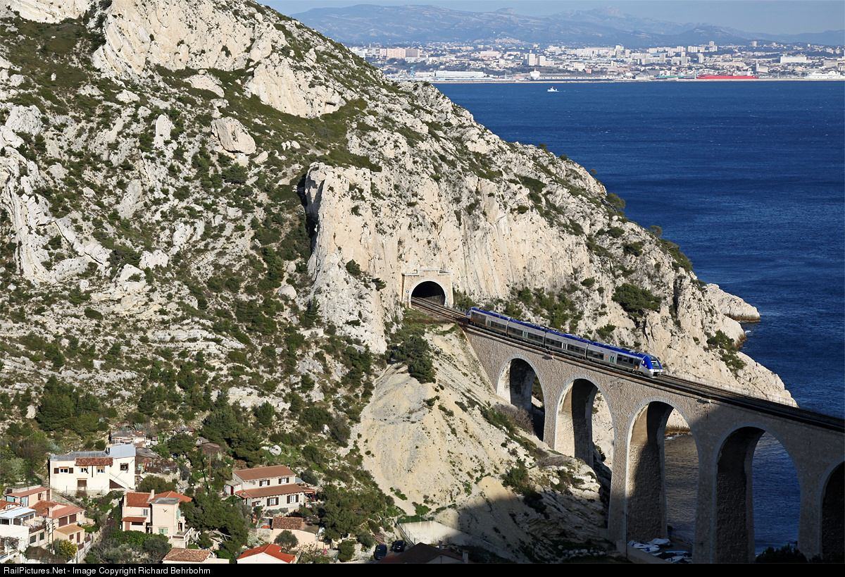 | A regional train Miramas - Marseille St Charles is crossing the viaduct La Vesse. At the coast there is the city of Marseille. |