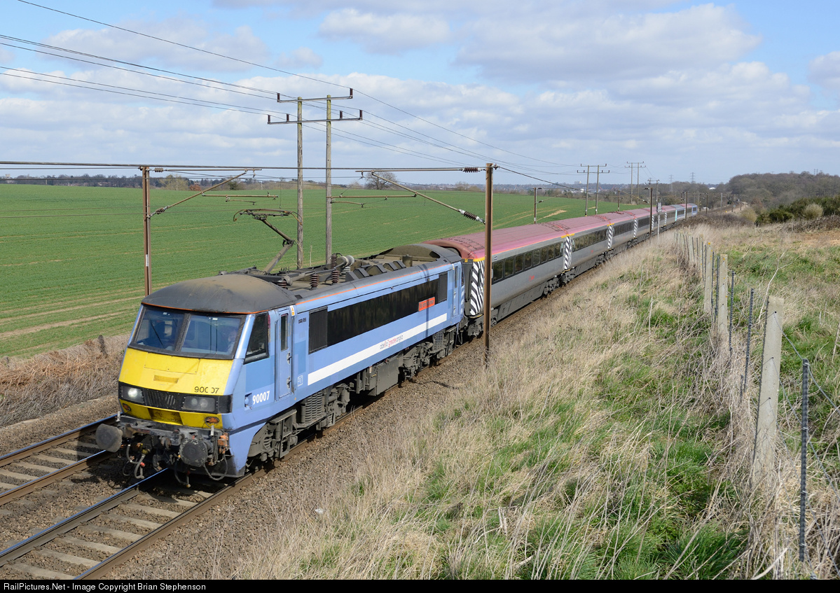 | Former British Rail class 90 Bo-Bo electric No 90 007 'Sir John Betjeman' climbs the 1 in 130 of Belstead bank as it accelerates away from Ipswich with the 11.30 Norwich to London Liverpool Street train formed mostly of ex-Virgin Mk III carriages from their disbanded "Pretendelino" set . This is one of the very few routes where locomotive hauled passenger trains can still be found in the UK abeit propelled back from London with the loco on the rear of the train. The locomotive bears testimony to the several changes of operator on this route from First Group to National Express to the current Abellio. |