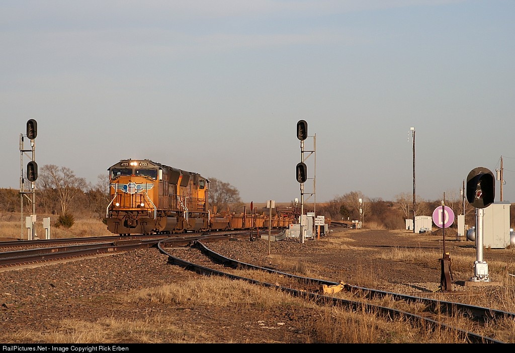 UP 4755 leads 110 baretables through the control point at Belvidere, NE on a spring evening. Not too many years ago it took all of the dogcatch crews one could rustle up in order to keep this railroad moving when the Marysville Sub was primarily single-track and the Kearney Sub was double track. All of the additional track work greatly enhanced transit times, but then the economy went south.