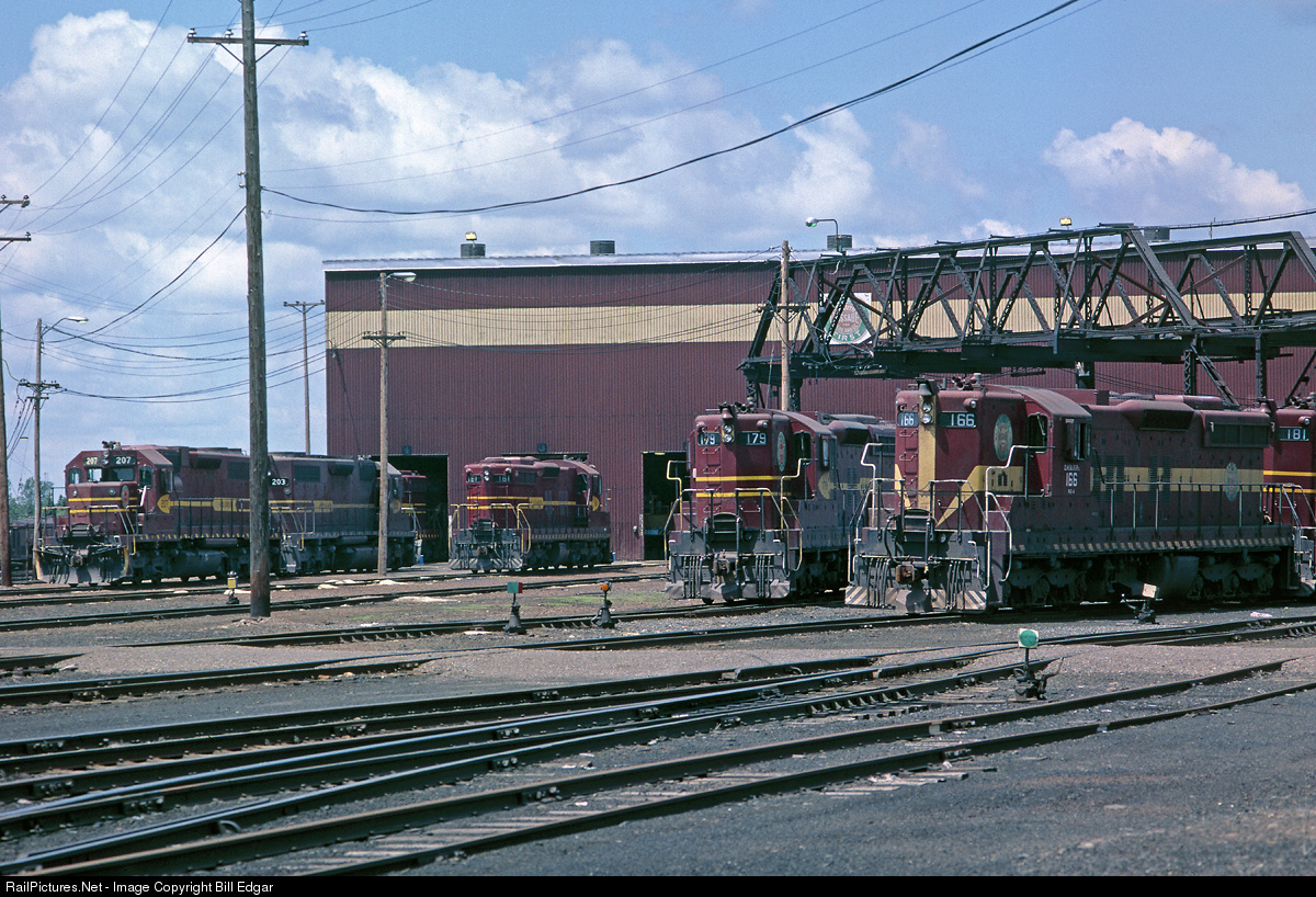 DMIR 166, a phase 4 SD9, resists the temptation of the newer arrowhead scheme while waiting with a mix of SD18s, other SD9s and SD38ACs for its next assignment. The yellow vertical stripe on the nose was a 1967 addition to the original mid-1950s color scheme.