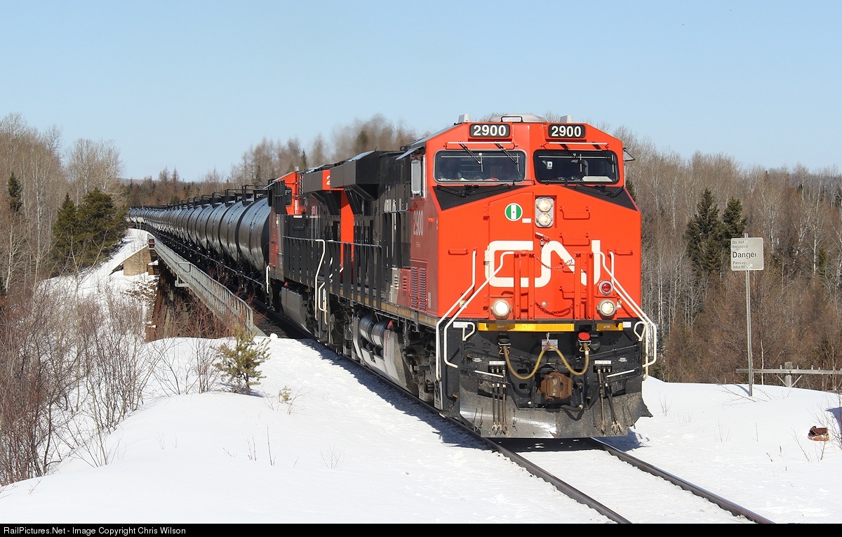 Down to 35mph, the new rule for crude oil trains, or loaded dangerous good between Winnipeg, MB and Capreol, ON on the CN line. It will be a long ride across the subdivision, just making it in their hours for this train. CN 2900 + CN 2923 have the honours pulling this 100 car loaded "CTCX" oiler from Edmonton, AB - St. Lambert, PQ