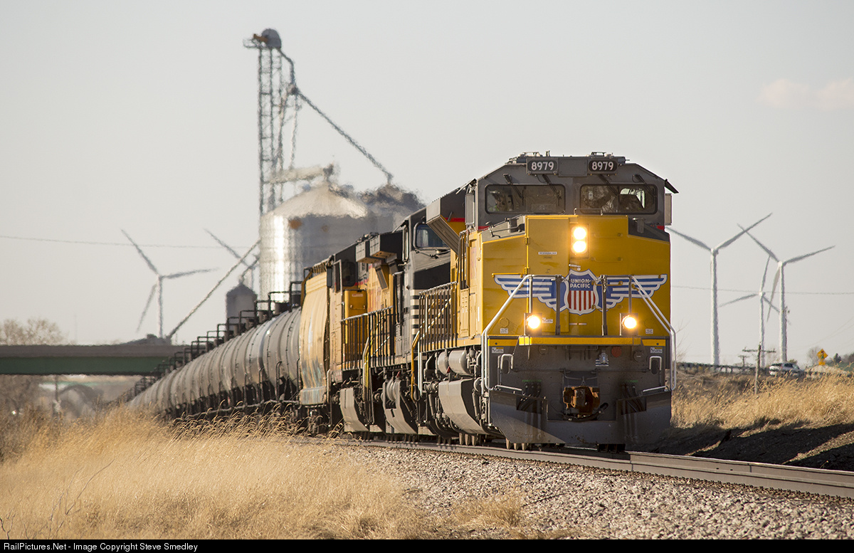 Norfolk Southern train 64D, a loaded ethanol train out of Iowa, blasts past Good Yard in Normal, Illinois, Southbound on the Bloomington District with engineer Steve Johnston at the throttle of a Union Pacific SD70AH, on Tuesday, March 31, 2015.