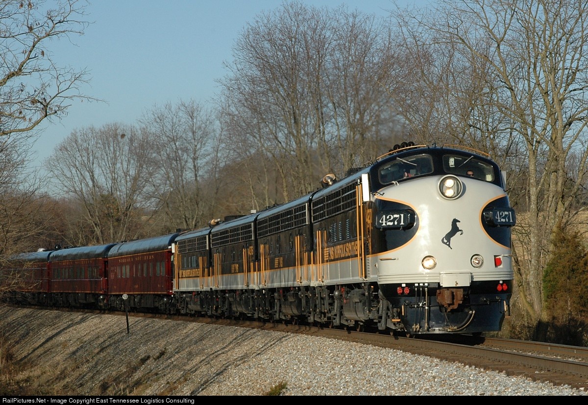 Norfolk Southern's Office Car Special, running as Central Division Train No. 956, comes around a curve late in the day on its way to Knoxville, Tennessee, for a crew change. From Knoxville, the train would be transferred to the Georgia Division at Bradley and proceed south toward Atlanta.