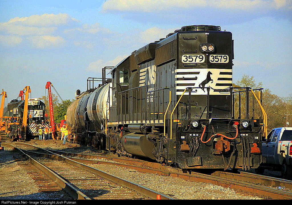 Norfolk Southern SD40-2 #3579 is waiting to move three tank cars (all were carrying sodium hydroxide solution) that have just been re-railed as crews from Hulcher and RJ Corman work together to get another SD40-2 #6194 re-railed.