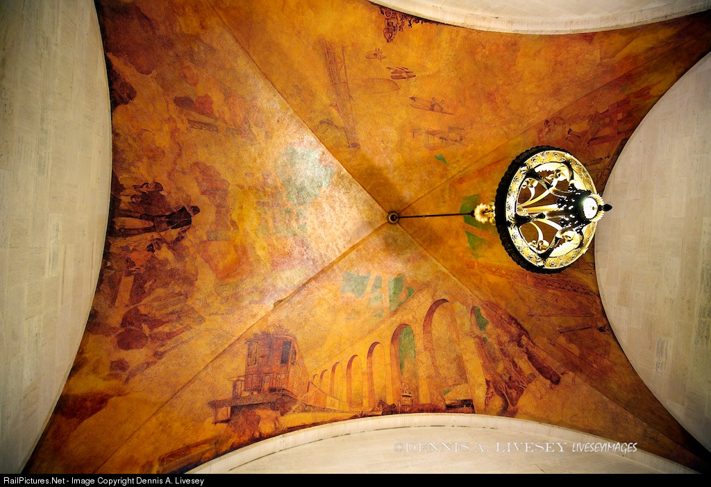 If you visit Grand Central Terminal, head for Tracks 17 to 11 and the Graybar Passage, go half way down, look up and you can see this mural. This work is titled “Transportation and Construction” and was painted in the late 1920's by Edward Trumbull. Trumbull is most famous for a ceiling mural he did across the street at the Chrysler Building. In this mural Trumbull created images of technological progress that includes trains and airplanes. And here at RailPictures.net, the mural we are interested in is the one showing T-1 electric No. 1166 sweeping a train along under the Highbridge in the Bronx. Other panels show track laying and airplanes in flight. Like the ceiling in the main concourse, the paint has suffered from severe yellowing, and I would think for the same reason, nicotine. If you are one of the 3/4 of million people who go through the building every day, do take in this sublime view.