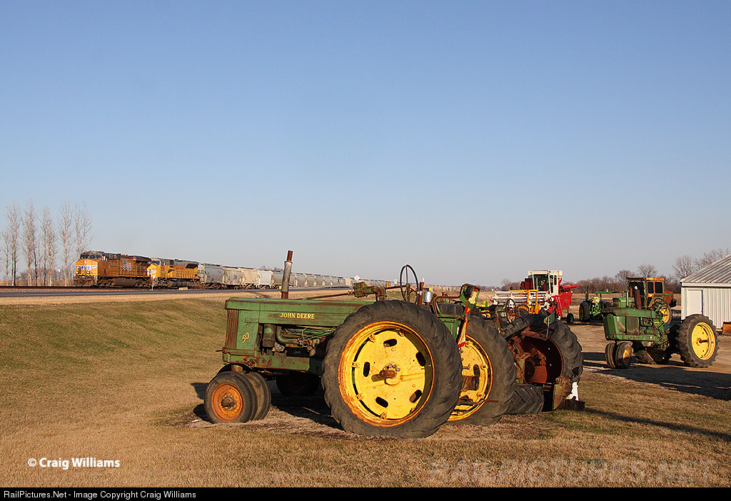 | A loaded sand train works upgrade between Lowden and Clarence on the ex-CN&W East-West mainline thru Iowa. Highway 30 parallels the mainline alot west of Clinton and along the highway is this place where someone has collected a few old tractors. Makes for nice afternoon place to shoot westbound trains. |