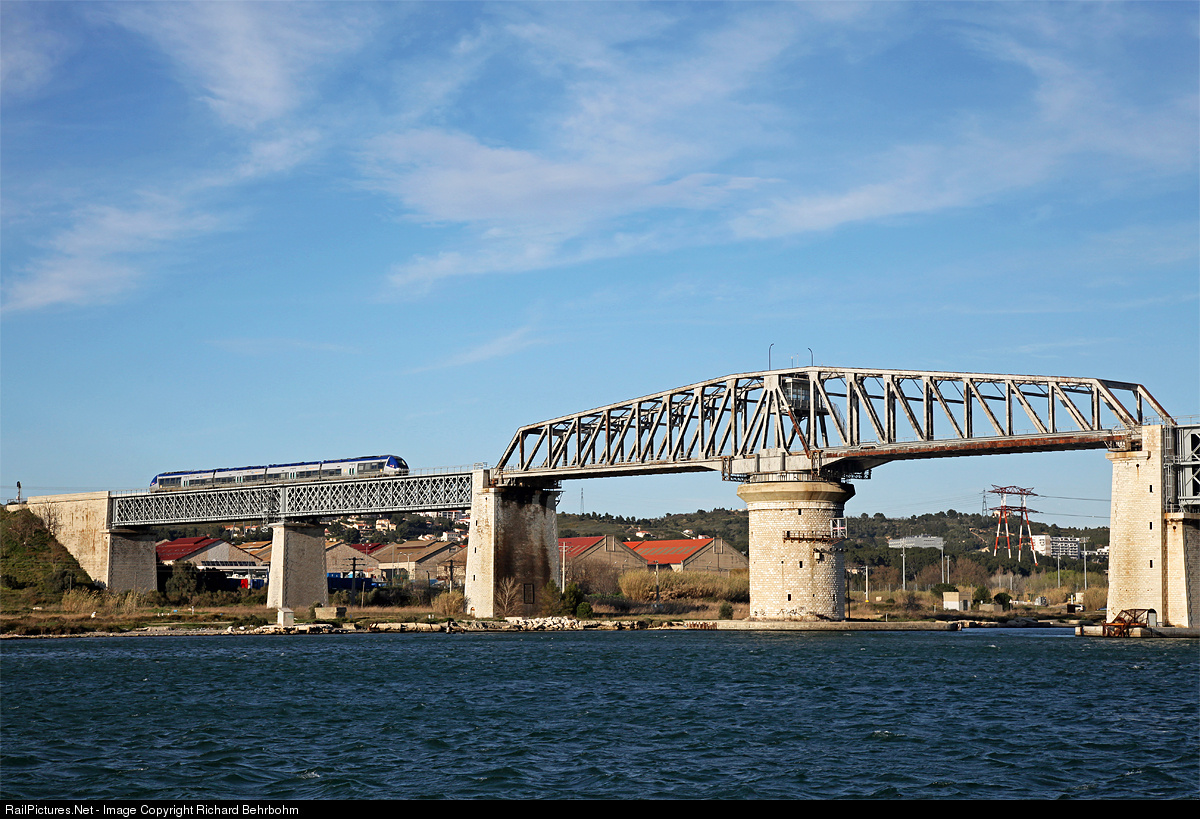| A Regional Express Miramas - Marseille is crossing the Caronte Bridge, total length 943m (1032yd). The section on the right is a swing bridge. |