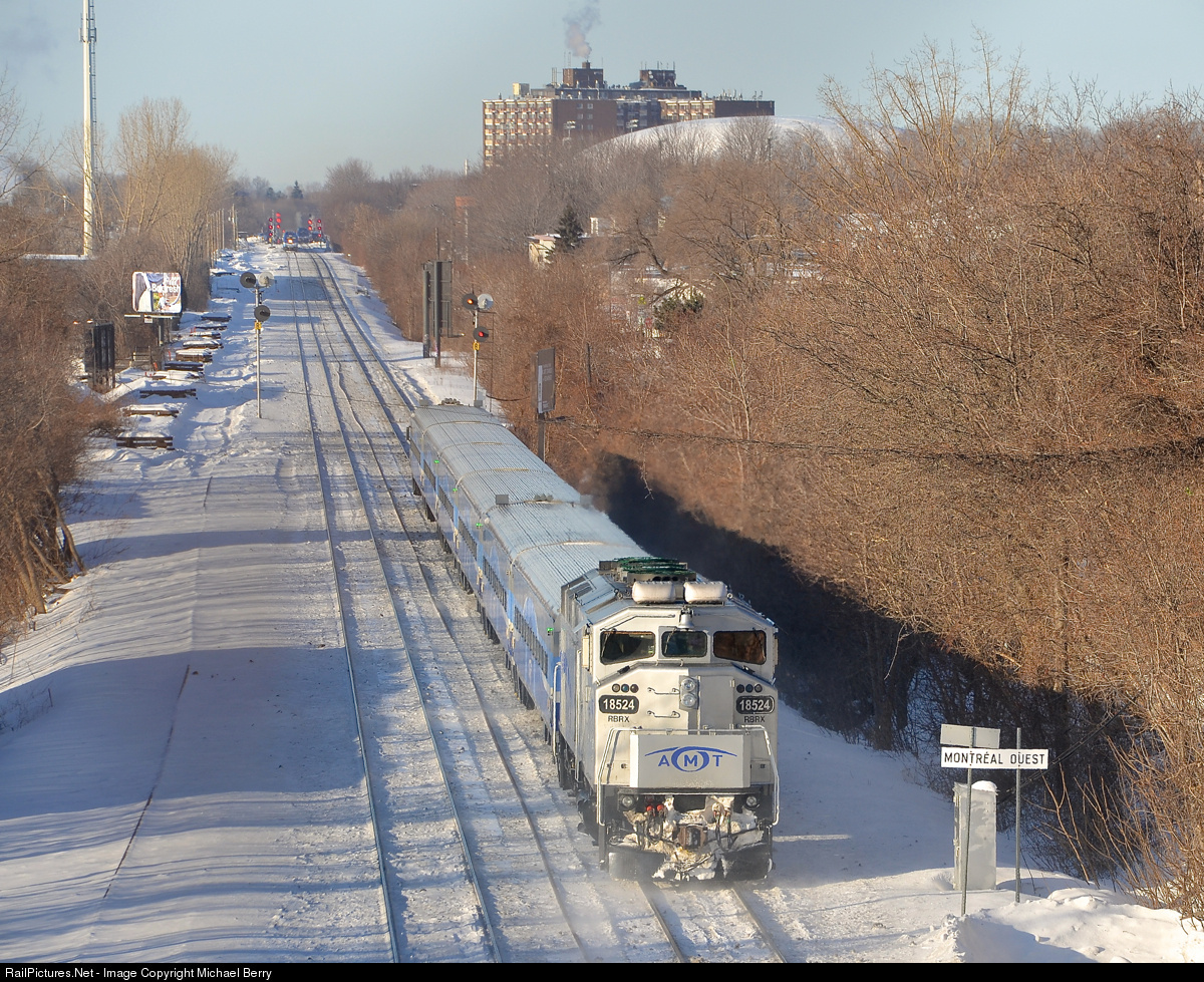 | A bit of green on the roof. Ex-GO Transit RBRX 18524 pushes an AMT deadhead movement towards Montreal West station during the morning rush hour. The station is in the far distance, and two more AMT trains are visible there. Of note is that the rooftop radiators on the F59PH are still green. |