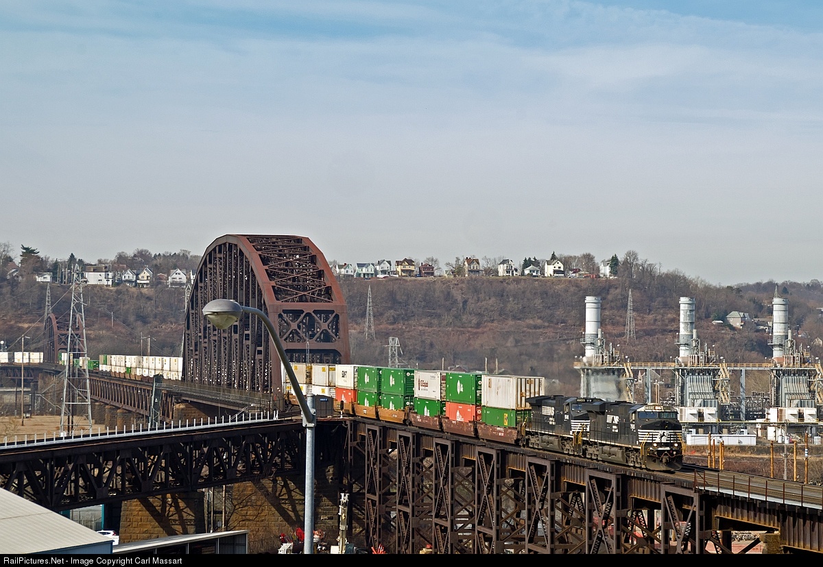 Crossing the Ohio River via the OC Bridge, a westbound intermodal is about to transfer to the Fort Wayne line. In the background is the Brunot Island Combined Cycle Power Plant owned by NRG Energy.