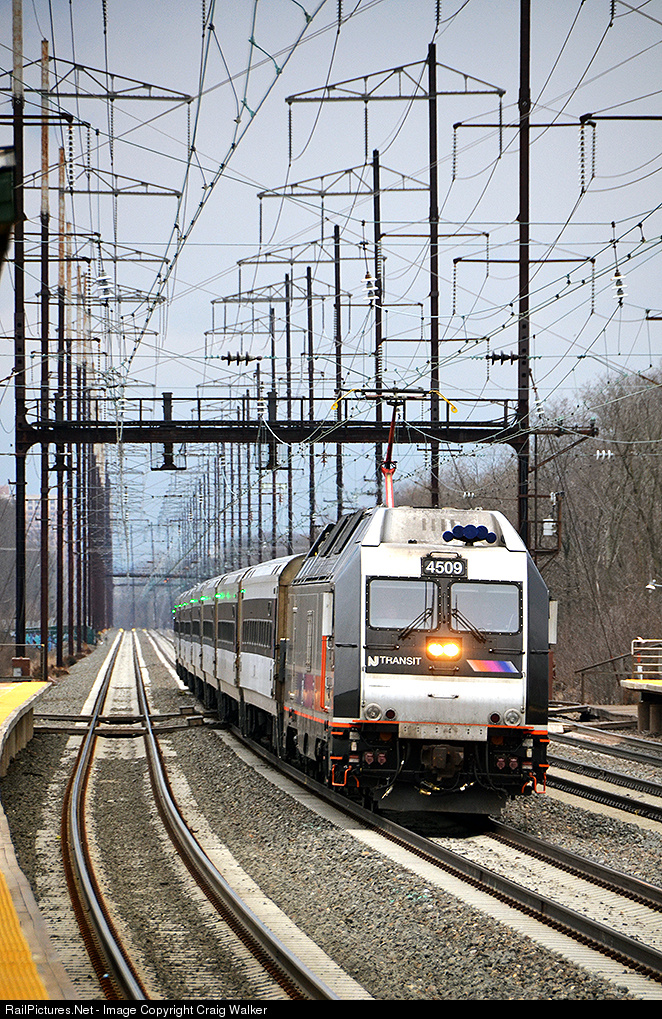 Deadheading from New Brunswick's Jersey Avenue station to Metropark, NJ Transit train 3738 blows through the Edison, New Jersey, station on its way north. By they time this train gets to Newark, it will be getting wet from the storm that was predicted earlier in the day. This eight-car train is powered by 4509, a Bombardier ALP-45DP.