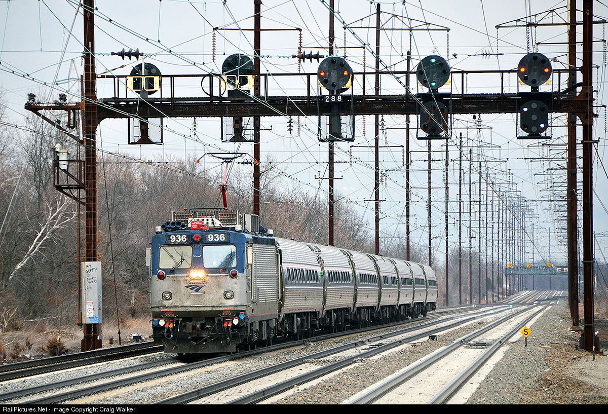 Amtrak AEM-7 936 hustles train #129, a seven-car Northeast Regional, through the NJ Transit station in Edison, New Jersey, on March 31st, 2015. This train, heading from New York, NY, to Washington DC, will make its next stop in Trenton, NJ, in another 19 minutes (an 27.8 miles further).