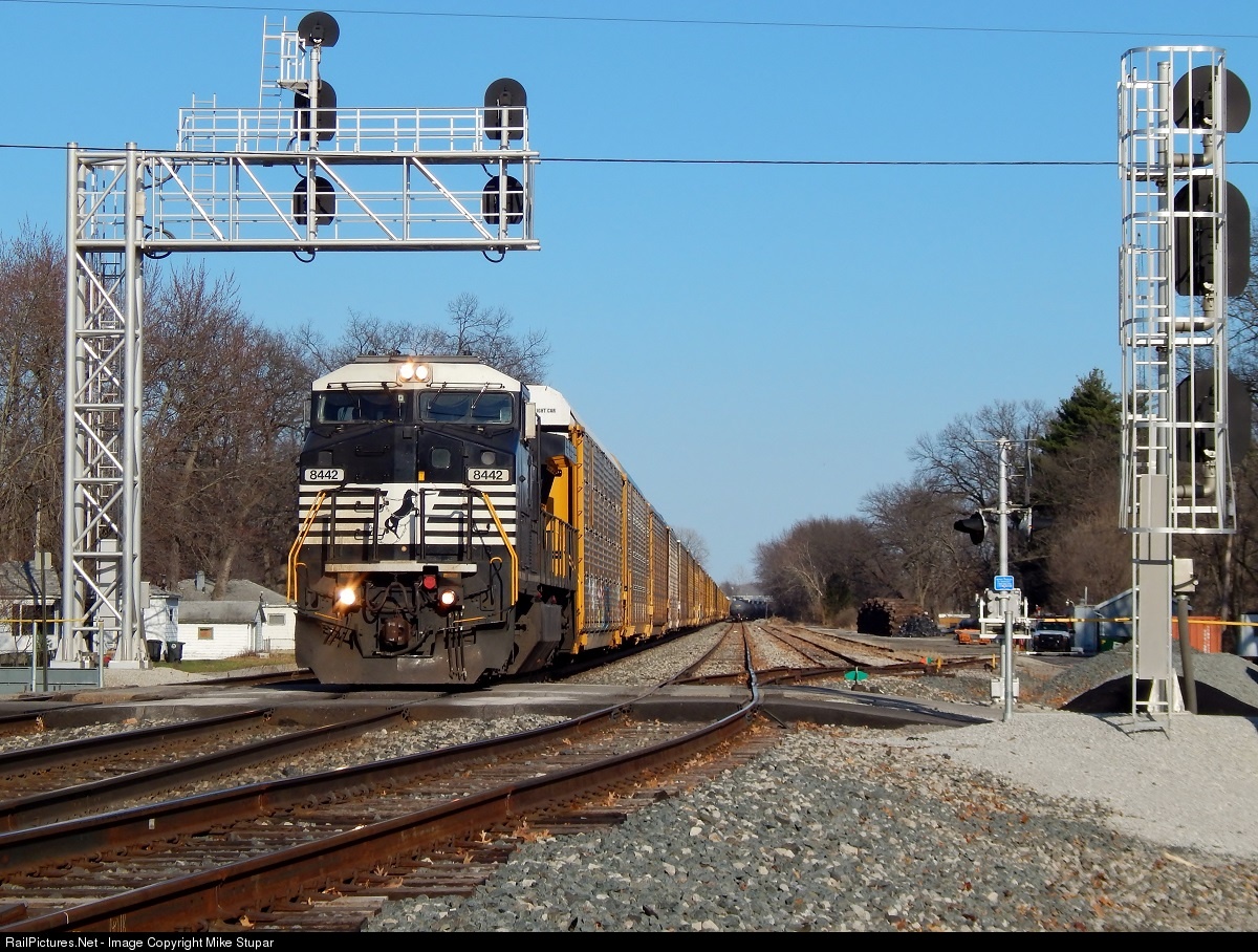 NS 8442 leads a string of autoracks west through Hobart, IN.