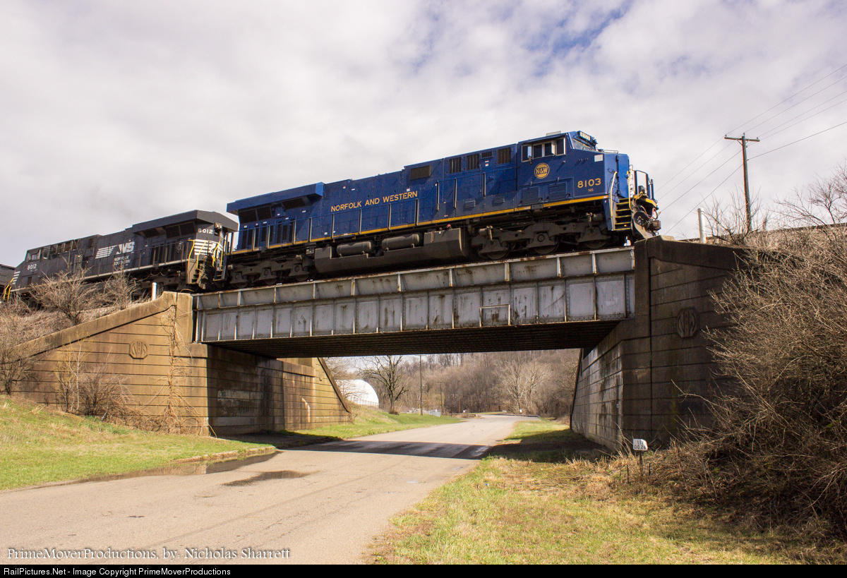| The Norfolk and Western heritage unit traversed home rails this afternoon on the N&W Columbus District between Columbus and Portsmouth, Ohio. I was able to catch them near Piketon at the old US Route 32 underpass which still bears the N&W logos in concrete as well as on the bridge. It rained for most of the day but for reasons unknown the sky opened up and the sun shined through briefly at this particular location. |