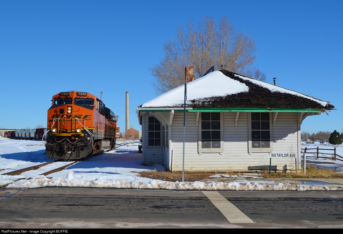 BNSF 7906 (ES44DC) waits in front of the Great Western Railway depot located in Loveland, Colorado. Soon the historic depot, built in 1902, will be moved to Granby, Colorado to provide a period structure for a proposed railroad museum honoring the Moffit Road line.