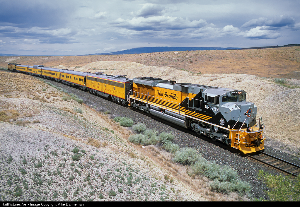 Traveling eastbound on Union Pacific’s North Fork Subdivision, an Operation Lifesaver special is between Payne and Rogers Mesa, Colorado, on June 14, 2009. Powering the passenger train is Rio Grande heritage locomotive No. 1989 and E9B No. 963B, and on the other end is GE AC4400CW No. 7250 used on westbound trips on the branch.