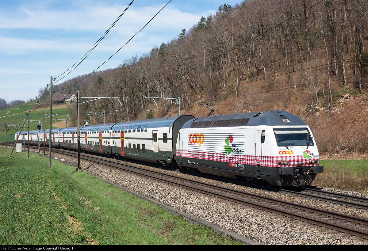 | Re 460 083 with publicity paint scheme for the large swiss retail company "Coop" is pulling a "IC2000" doubledeck push pull train from Basel to Lucerne near Tecknau. |