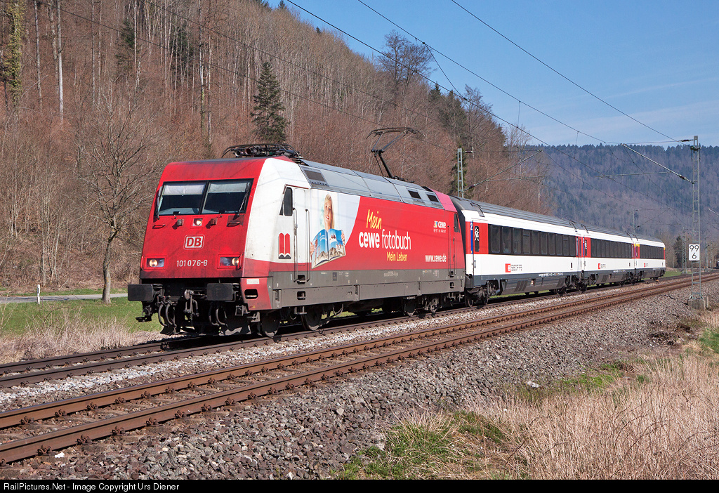 | 101 076, painted in the publicity paint scheme for CEWE (the biggest foto finishing company in Europe), is pulling IC 183 from Stuttgart to Zürich. |