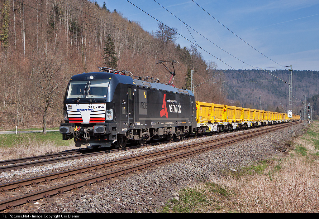 | 193 854 from DB Fahrwegdienste, leased from MRCE Dispolok, is pulling an excavated material train to Rottweil. The excavated material is from the "Stuttgart 21 Railway Station" construction aera. |