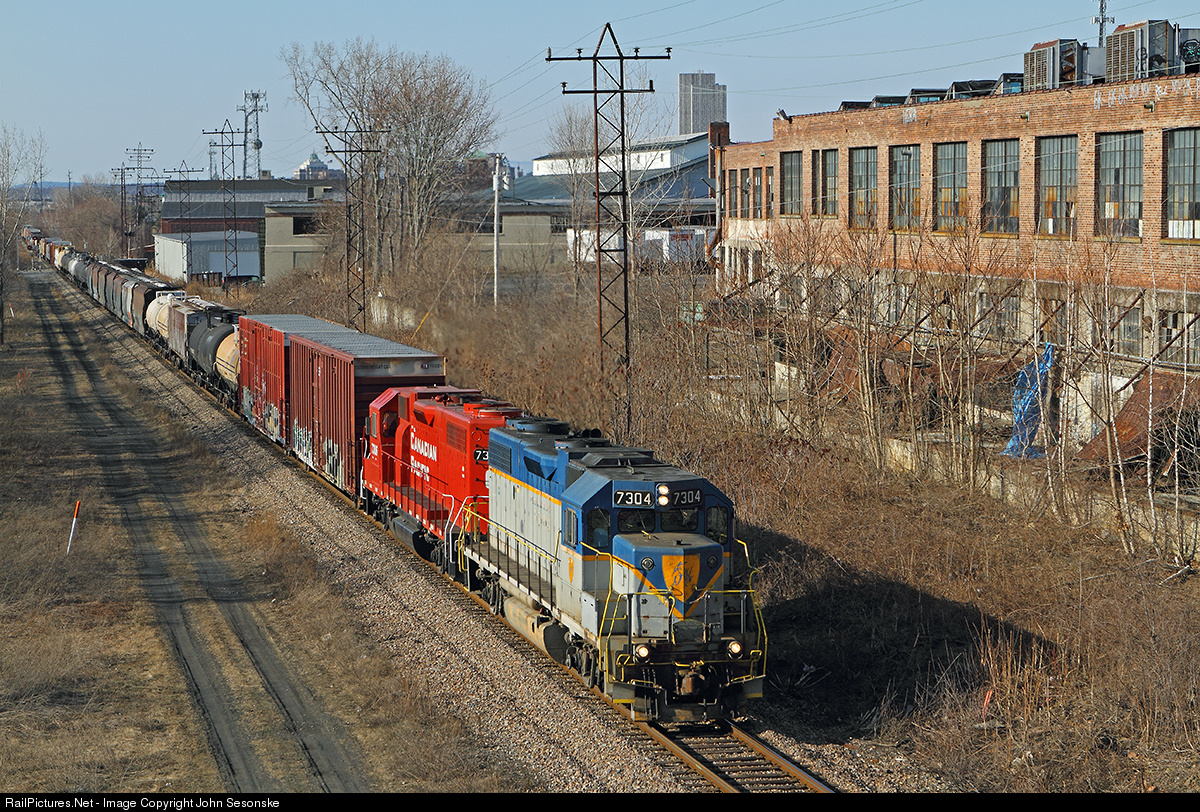 | The Easter Sunday version of CP's Saratoga-Kenwood (Port of Albany)- Saratoga turn job rolls NB on the old D&H with a 56 car train. Two former Lehigh Valley units are on the point with one of the last two D&H lightning stripes leading the former D&H 7306. April 1, 2015 marked 39 years of continuous service on the D&H for these engines. They were conveyed from the LV to the D&H when Conrail was created on April 1, 1976. |