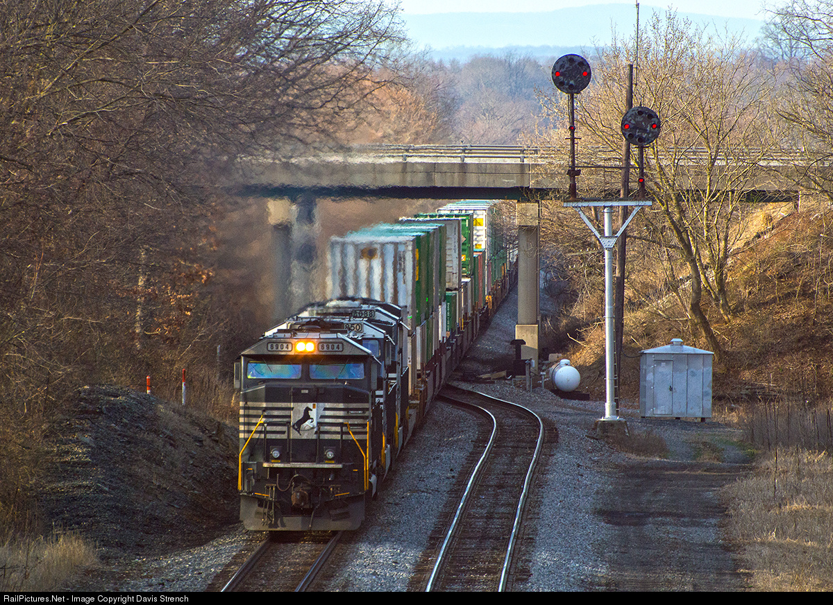 NS 201 and 202, a relatively recently established service lane, are the only intermodal trains that traverse the entire length of Norfolk Southern's ex- N&W Hagerstown District. Here northbound Train 202 from Memphis, TN knocks down the last signal on the H-Line and enters Vardo Yard. A quick trip up the Lurgan is the only thing that separates this hotshot from its final terminus of Harrisburg, PA.