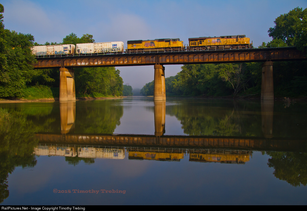 UP AC45CCTE #5512, SD70M #3831 lead UP train QNPCXP-01 across the Meramec River on the UP (ex-MoPac) Jefferson City Sub in Sherman Beach Park near the small town of Sherman, MO on August 2, 2014.