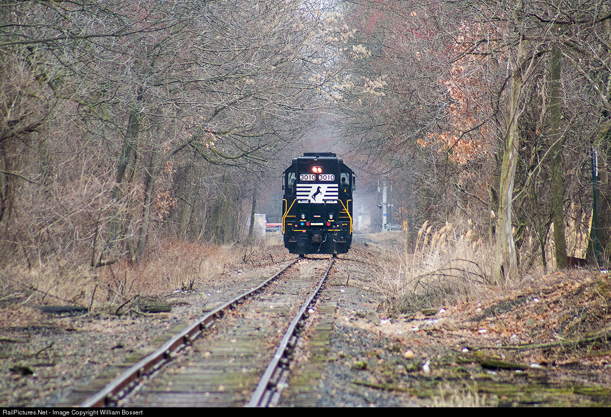 | Norfolk Southern H02 with 3010 (light) heading east to a Totowa New Jersey industry shown at Wayne, Mountain View NJ on the former Lackawanna Railroad Boonton line, a once thriving two to three track main line with class 1 commuter and long distance passenger trains blazing through at speeds up to 70 mph plus along with many long freight trains is now relegated as a spur called the Totowa spur. The line is now just one single track and is in a cocoon of brush and trees and used only twice a week on what used to be. |