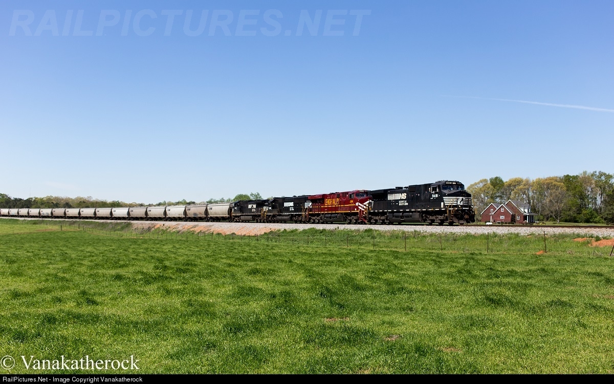 Norfolk Southern loaded grain train 40D heads south through Barnesville, GA with the Lehigh Valley heritage unit trailing.
