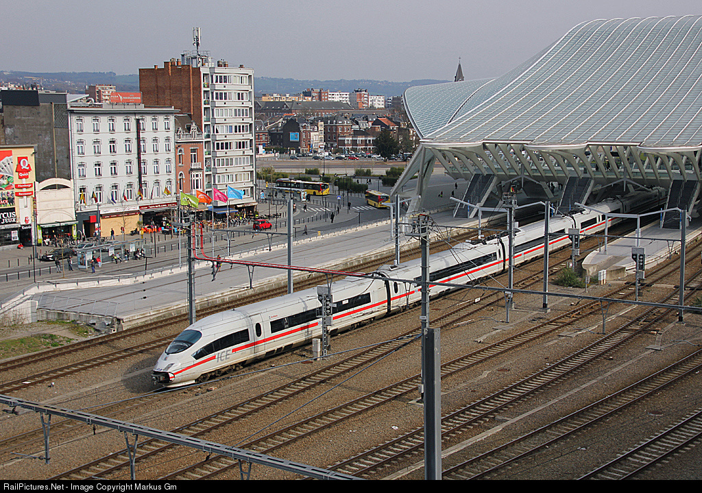 | ICE from DB (Deutsche Bahn) from Frankfurt (Main) to Brussels (Bruxelles-Midi) leaves Liège-Guillemins with the imposing roof in the evening sun |