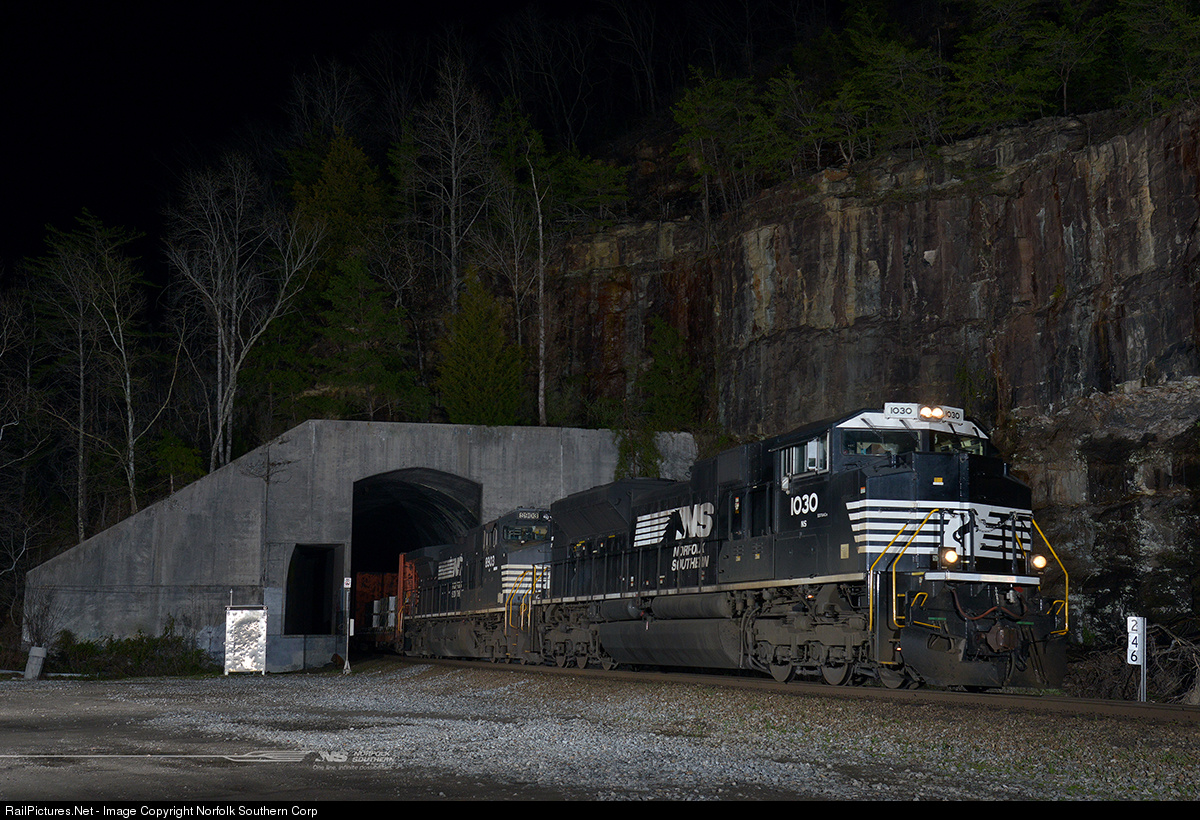 Norfolk Southern train 117 exits the south end of new Tunnel 24 at Nemo, Tennessee, along the second district of the CNO&TP, commonly referred to as the "Rathole". Prior to a massive realignment and upgrade project of the 1950s and 60s, the line traversed 27 tunnels and 105 bridges. Today it only passes through four tunnels, but also features impressive deep rock cuts and many bridges, and retains the "Rathole" nickname. The four upgraded tunnels were built with electrification im mind. That idea never panned out, but the added clearance is beneficial for the larger modern freight cars moving across one of NS's busiest routes along the Central Division. Train 117 is a daily general merchandise freight operating between Bellevue, Ohio, and Chattanooga, Tennessee. EMD SD70ACe #1030 is the unit that represented the current NS paint scheme during the heritage unit gathering in 2012 at Spencer, North Carolina. Photo by Casey Thomason. For more information about Norfolk Southern, visit www.nscorp.com