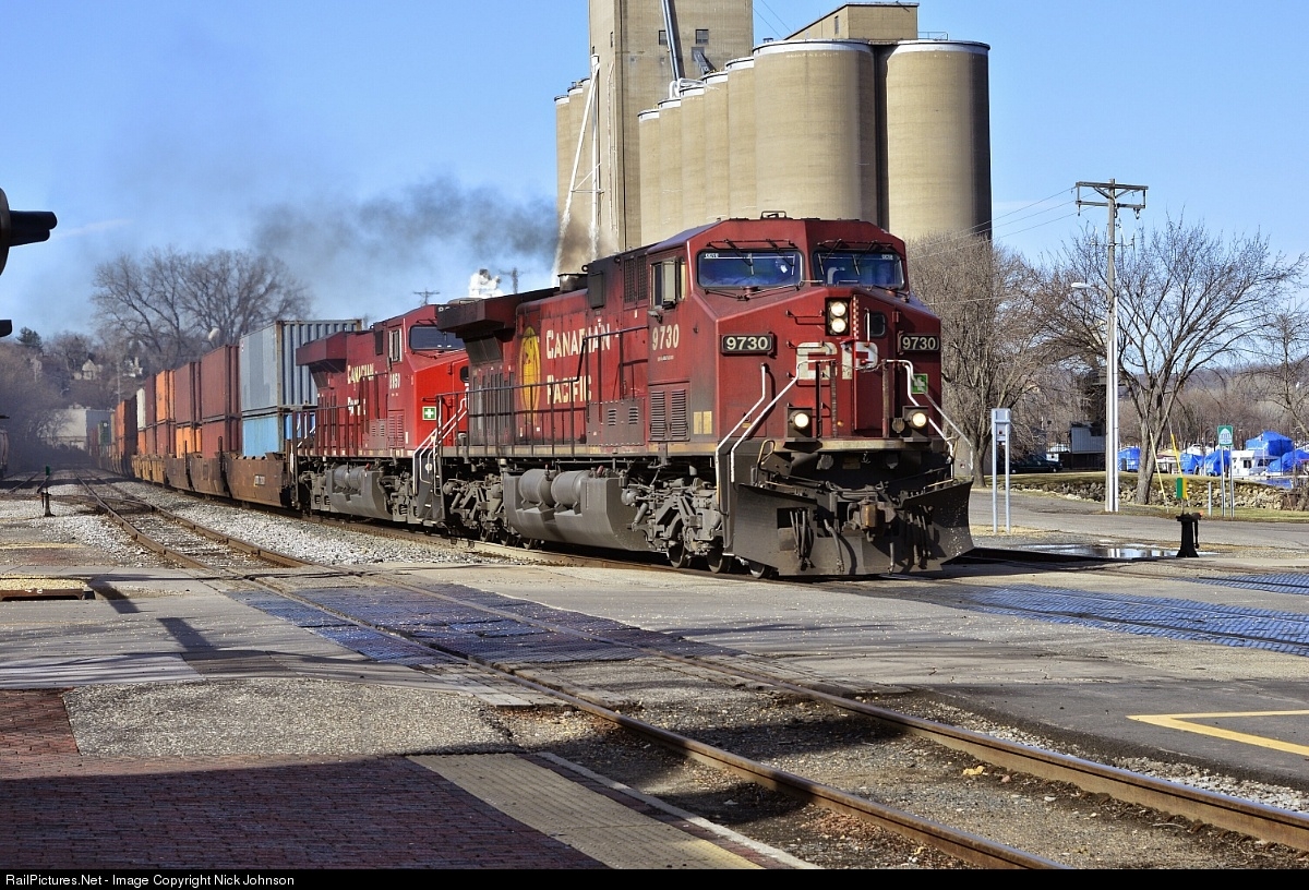 | CP AC440CW #9730 smokes it up a bit as CP AC4400CW #9730 and CP ES44AC #8950 provide power to CP Train Number 198 as it passes the Red Wing Amtrak depot in Red Wing, MN. Photo taken on 4/2/15 near MP 370.69 on the CP River Sub. |