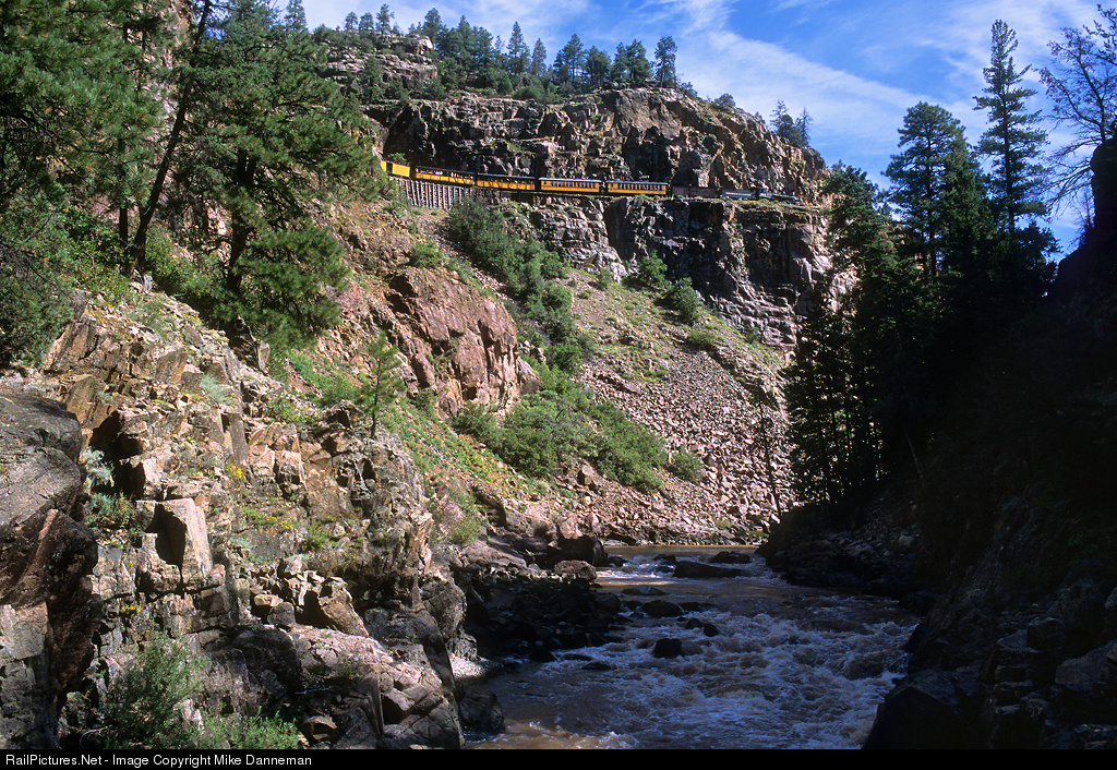 Clinging to the cliff high above the Animas River, A Durango and Silverton Narrow Gauge train creeps westbound (northbound) on the High Line outside Rockwood, Colorado, on August 24, 2006.