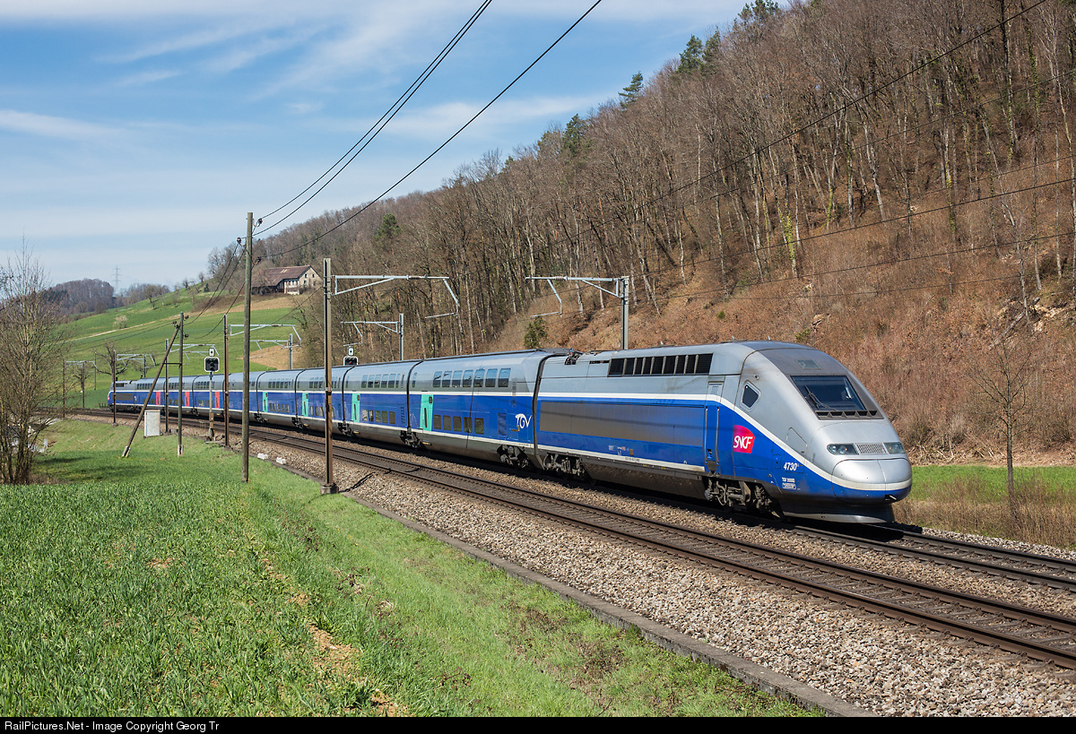 | Doubledeck TGV 2N2 (two deck second generation) "Euroduplex" # 4730 of the SNCF is running as TGV 9211 from Paris Gare de Lyon via Basel to Zürich on the Hauenstein line near Tecknau. |