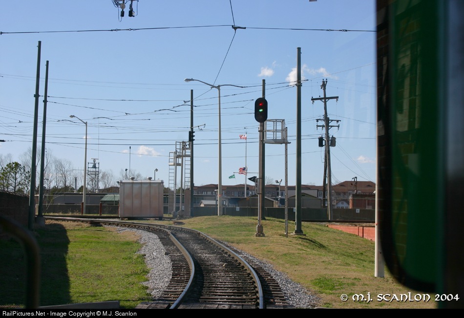The MATA Riverfront Loop trolley gets a green signal to enter the CN Memphis Sub at Pyramid.