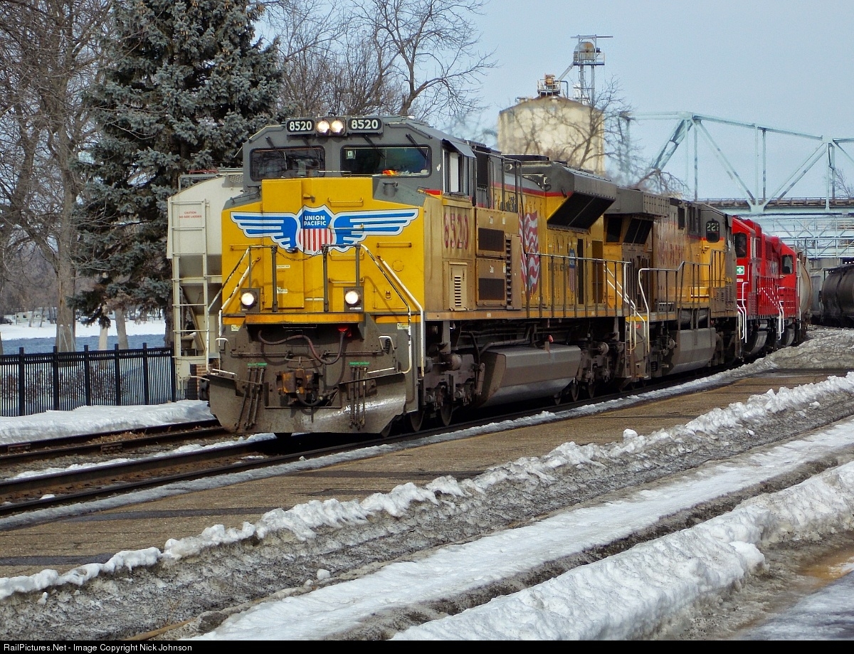| UP SD70ACe #8520, another UP unit, and two CP units provide power to a Westbound CP manifest as it passes the Red Wing Amtrak depot. Photo taken 3/9/14 near MP 370.69 on the CP River Sub. |
